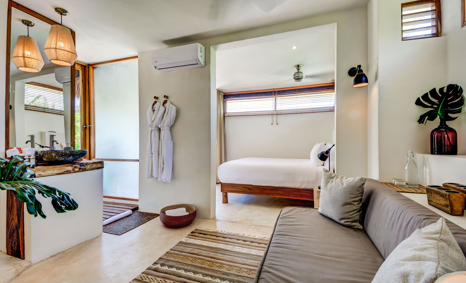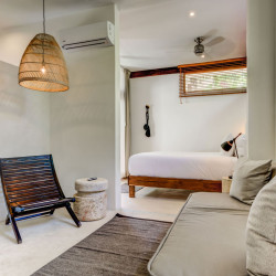 | Bedroom Experience | The master suite feels tucked into the treetops with a king bed, sheltered terrace, and soft morning light. Two additional suites each offer queen beds and opening onto private decks—one faces the garden, the other catches ocean breezes. Every space reflects an easy, boho style with handcrafted touches and light textures. |
