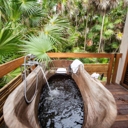 - 1 King size bed, Air conditioning, Bathtub, Ceiling fan, Dual vanity, Ensuite bathroom with indoor & outdoor shower, Outdoor bathtub, Private balcony with ocean and Jungle views, Safety box, Sleep Eight Matresses with Frette bedding, Sonos central sound system, TV, Wifi access, Window screen, Yucatan Senses organic toiletries