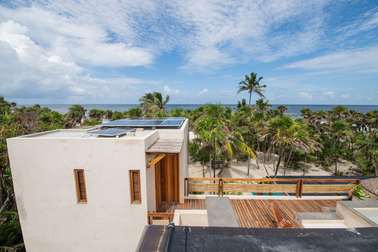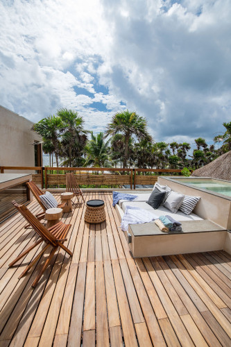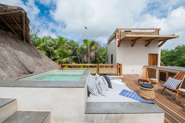 | Design & Amenities | Central palapa living area, rooftop lounge with plunge pool, open-air dining, fully equipped kitchen, Wi-Fi, daily housekeeping |